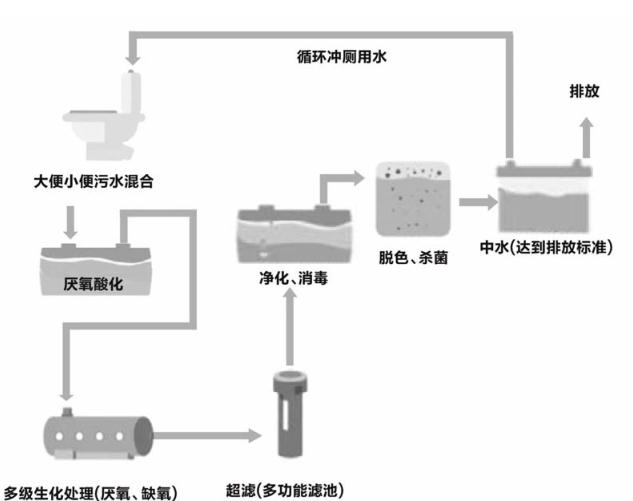 采用微生物技術(shù)和生化技術(shù),將大小便經(jīng)過厭氧、好氧等有機物反應(yīng),對有機物進行分解消耗,再通膜過濾,消毒達到水質(zhì)凈化并實現(xiàn)持續(xù)循環(huán)使用。
